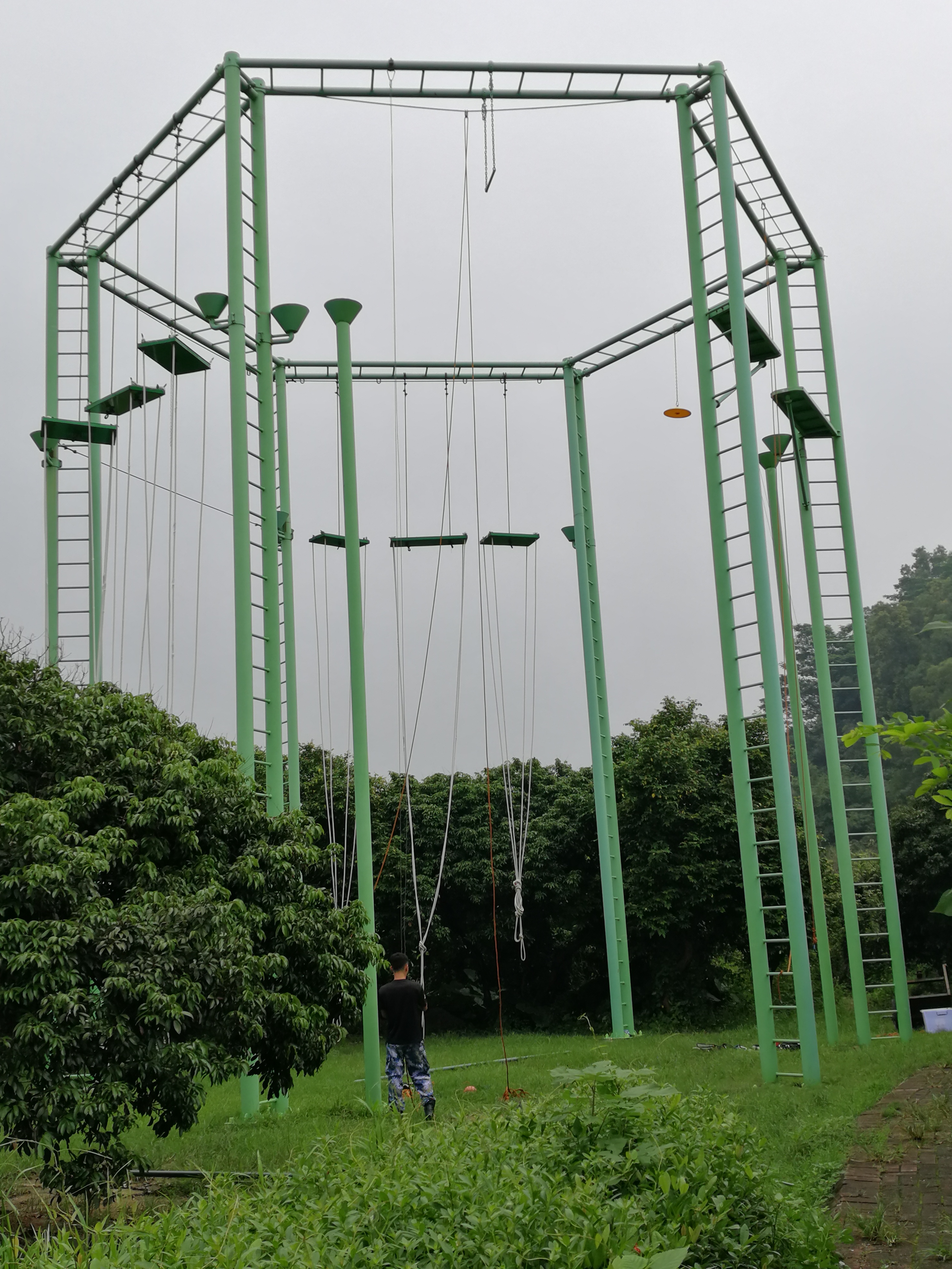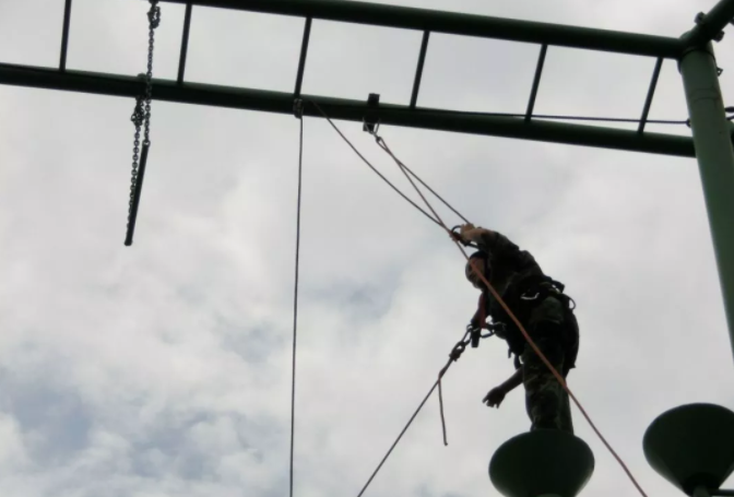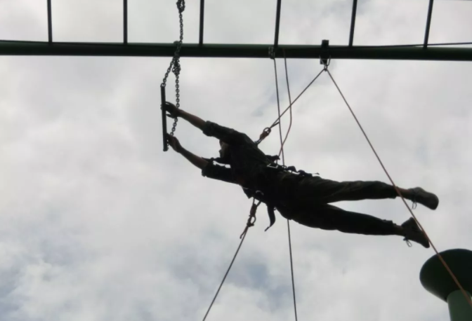 空中單杠是一項自我挑戰的高空高難度項目,隊員需要在9米高臺,直徑25公分的圓臺上站立,奮力跳躍抓住空中的單杠。挑戰自我,客服心理障礙,培養自信心。面對機遇,能果斷把握,增強自我決斷的能力,以積極冷靜的心態去爭取。樹立對困難、對問題不懼不卻以及挑戰的魄力。