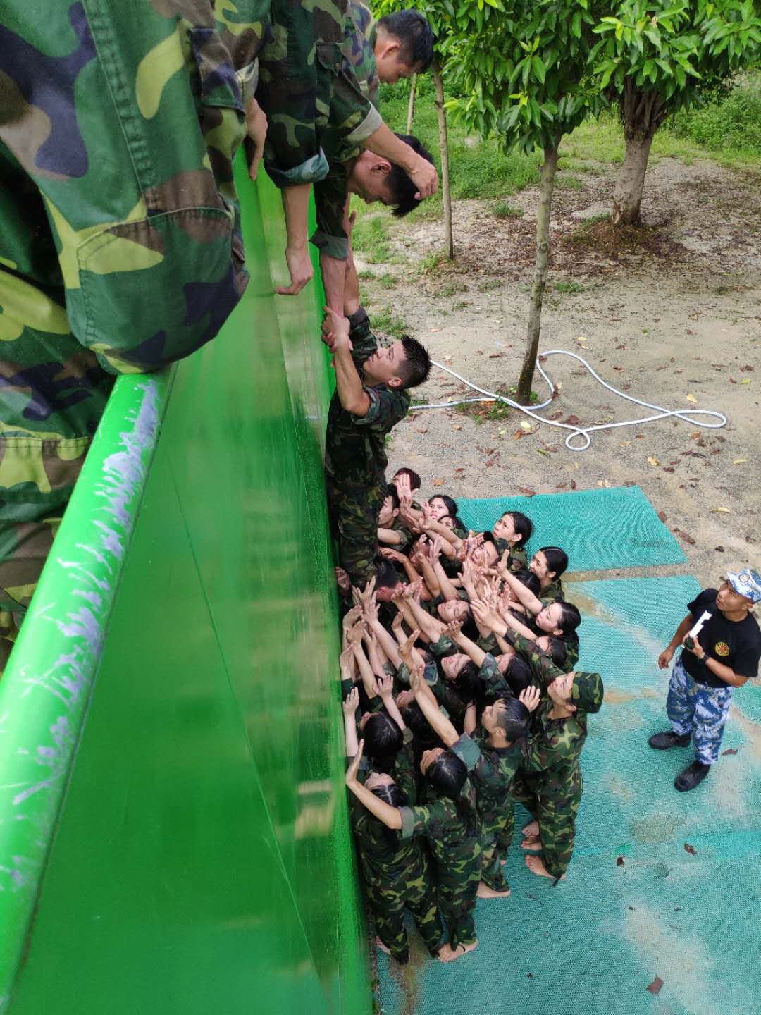 畢業墻,一個令人聞風喪膽的考驗,充分考驗團隊合作以及信任,人梯用自己的身體做底座支撐所有的隊員攀爬生氣墻,拼勁所有的力氣,穩固自身,維護攀爬人員能夠安全翻越;起重機用自己強而有力的手臂,與翻墻隊員締結生死扣,用盡所有也不會讓隊員掉下去;保護墻用他們溫柔而有勁的手掌,讓我們沒有后顧之憂。最終,我們大銘不銹鋼團隊榮獲“卓越團隊”完成挑戰,超越自我。